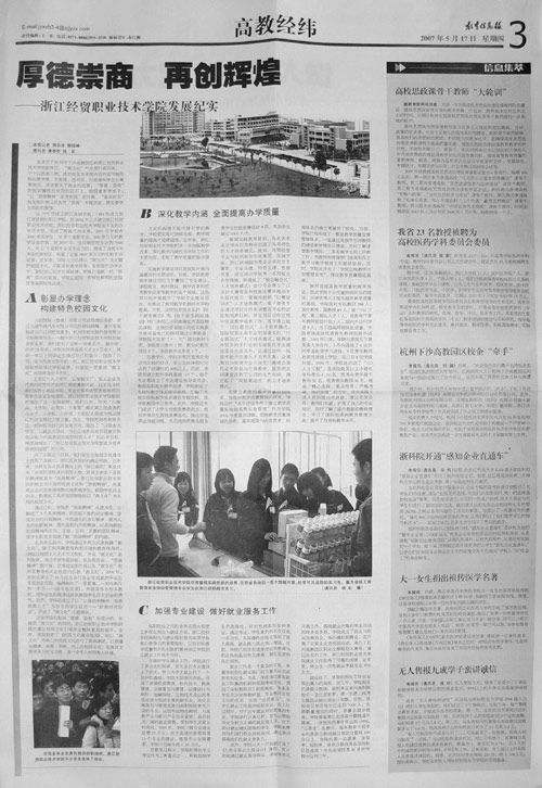 高职院校之间的竞争在很大程度上体现在招生与就业方面。浙江经贸学院将招生与就业的指标视为体现学校核心竞争力的重要指标,以良好的教学质量和开拓创新的精神保证学院招生就业工作连年向好。