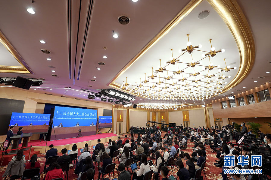 5月28日下午,十三届全国人大三次会议在北京人民大会堂举行记者会,国务院总理李克强应大会发言人张业遂的邀请出席记者会,并回答中外记者提问。这是记者在梅地亚中心多功能厅采访。 新华社记者 金良快 摄