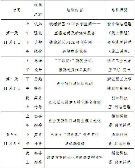培训内容涵盖“互联网+”赛况与获奖作品案例、大学生“农创客”角色定位与参赛策略、创业项目与团队规划、创业团队组建与孵化培育、创业竞赛项目与商业模式优化、大学生科技创新案例、投资路演等内容,并以校企合作方式定制杭州网红业态、直播电商等相关课程。本次培训时间为45学时,具体培训内容如下: