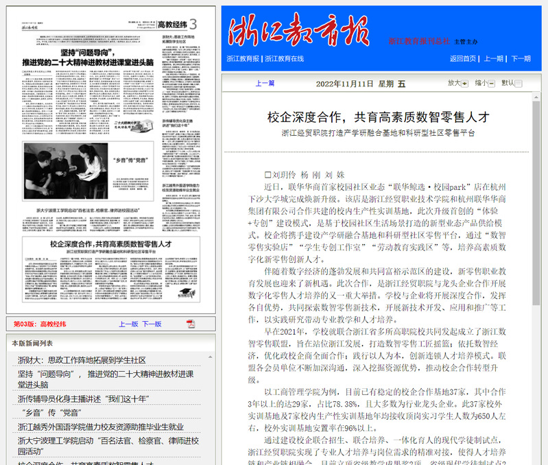 早在2021年,学校就联合浙江省多所高职院校共同发起成立了浙江数智零售联盟,旨在站位浙江发展,打造数智零售工匠摇篮;依托数智经济,优化政校企商全面合作;践行以人为本,创新连锁人才培养模式。联盟各会员单位不断加深沟通,深入挖掘资源优势,推动校企合作转型升级。