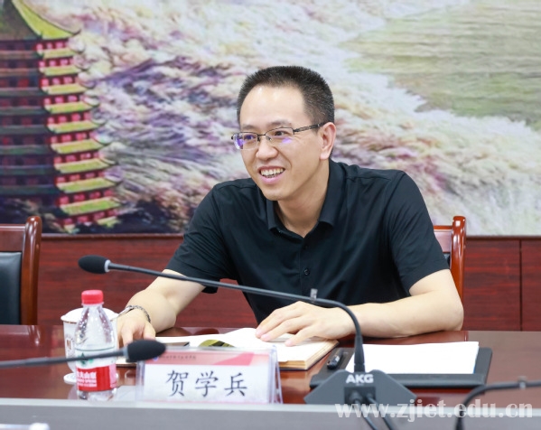 陈德泉对贺学兵一行的到来表示欢迎,并从学校的历史沿革、专业设置、科学研究、区校合作和国际交流等方面,对学校的基本情况和近年来取得的成绩进行了介绍。他表示,学校自2005年搬迁至钱塘区,得到了钱塘区全方位的帮助和支持。学校也紧密贴合钱塘区经济社会发展需要,充分发挥职业教育深化产教融合、校企合作的教育属性,依托校社政企“四方合作”理事会等平台,与区政府和辖区各企事业单位开展了深度交流与合作,实现校地合作赋能高质量发展的“双向奔赴”。他希望区校能够进一步拓宽合作视野和合作领域,在社会科学研究、国际化交流等方面,寻找新的合作点,凝练优秀的经验做法和合作案例,共同谱写区域经济社会与职业教育改革发展双促共赢的新篇章。